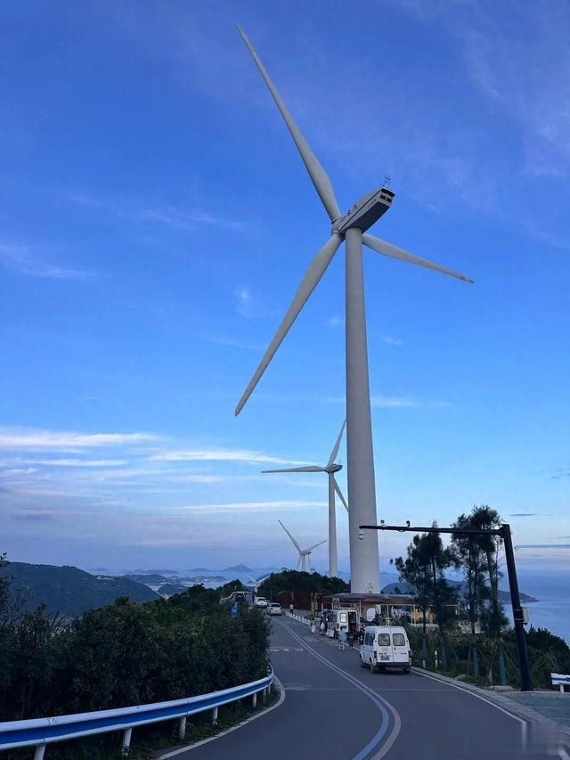 玉环一号公路能排进浙江前三!盘山公路一面是海,一面是山,白色风车顺着山脊排列,风一吹,像走进宫崎骏的动画。